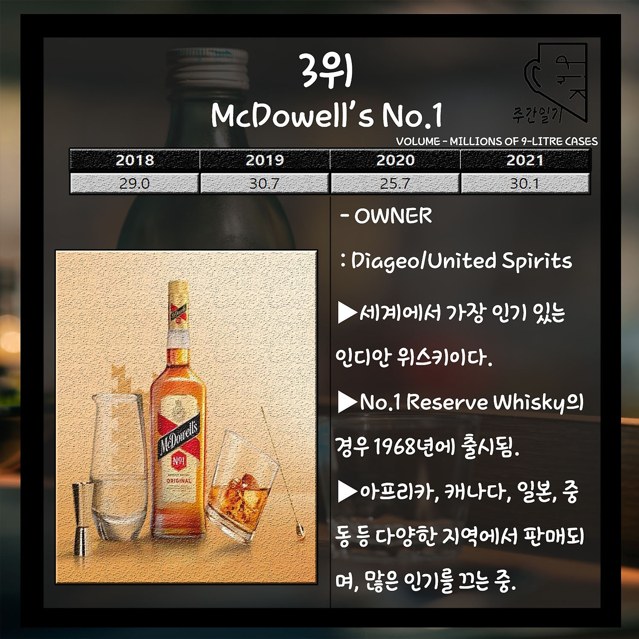 3위는 바로 '맥도웰 넘버 원'이다. 세계에서 가장 인기 있는 인디안 위스키인 이 술은, 아프리카, 캐나다, 일본, 중동 등 다양한 지역에서 많은 인기를 끄는 중이다.
