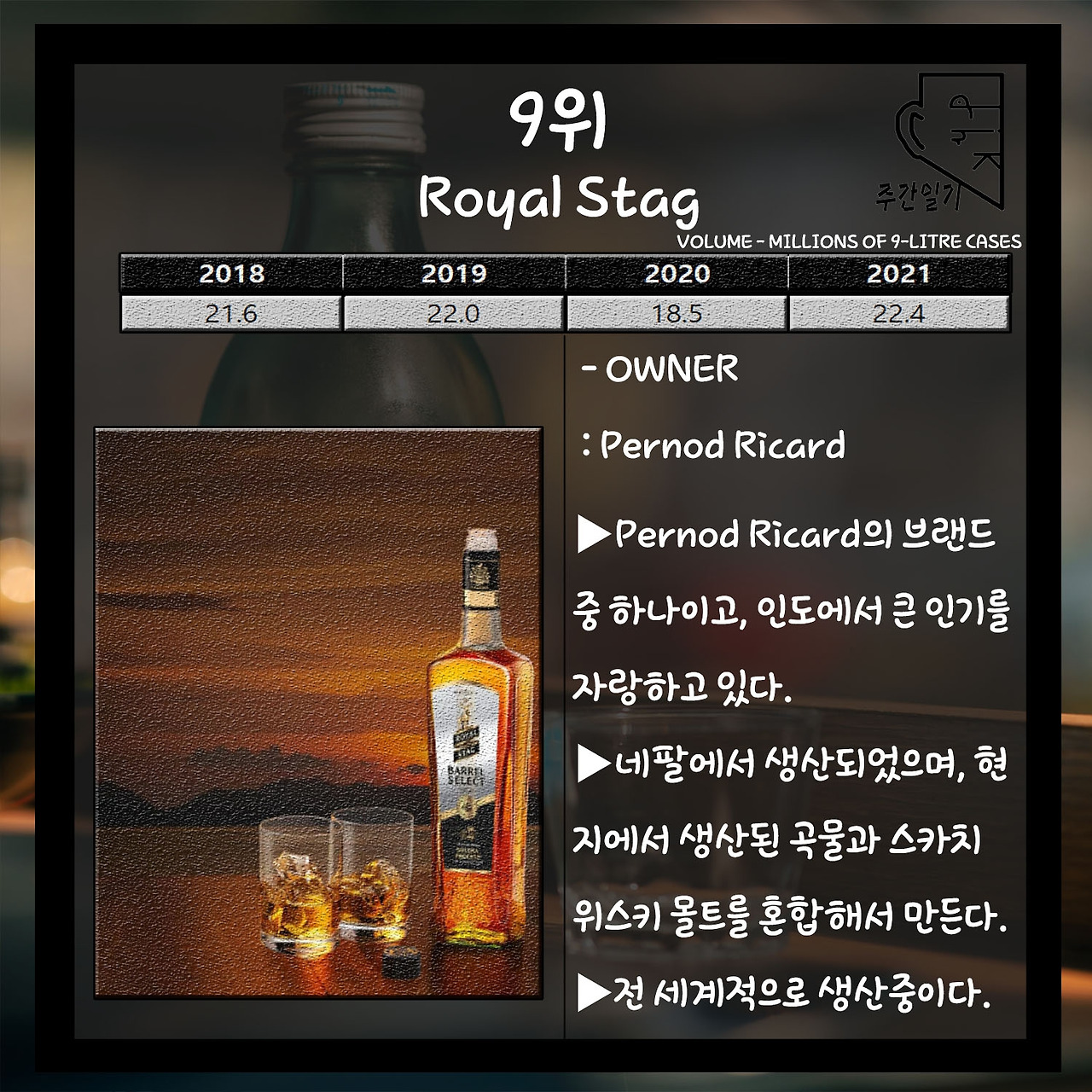 9위는 '로열 스태그'이다. Pernod Ricard의 브랜드 중 하나인 이 술은, 1995년에 출시되어 현재까지 큰 인기를 이어가고 있는 인도 위스키이다.