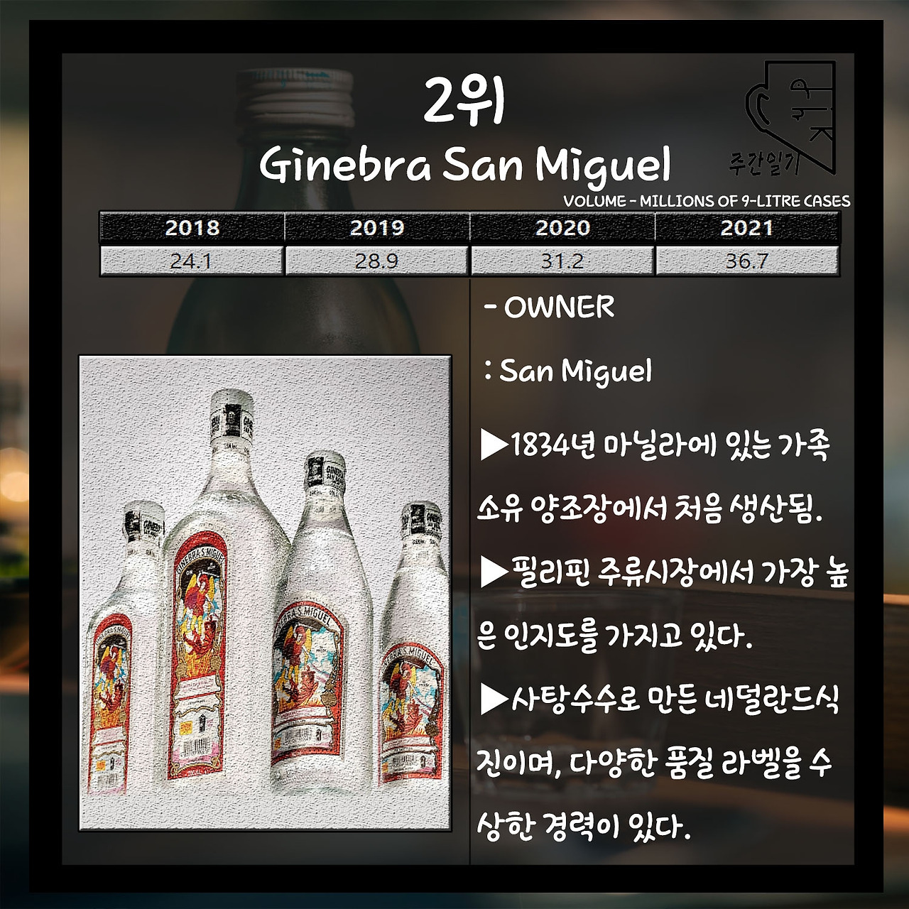 2위는 '지네브라 산 미구엘'이다. 1834년 마닐라에 있는 가족 소유 양조장에서 처음 생산된 이 술은, 사탕수수 주정으로 만든 네덜란드식 진이다.