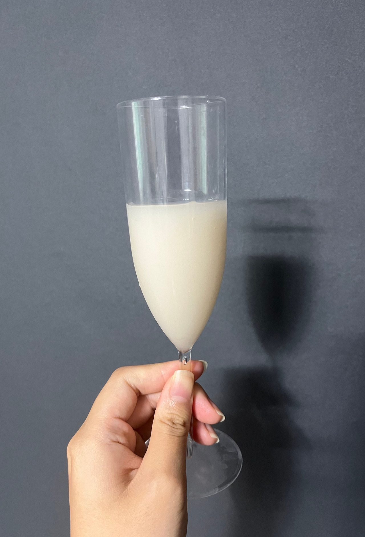충분히 섞어서 잔에 따른 술은 우유보다 살짝 옅은 색을 띄고 있다. 비교적 하얀 사과주스 색깔이라고 말하면 될까, 확실한 것은 그렇게 걸쭉해보이는 질감은 아니다.