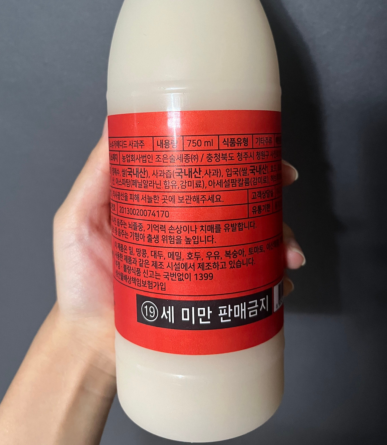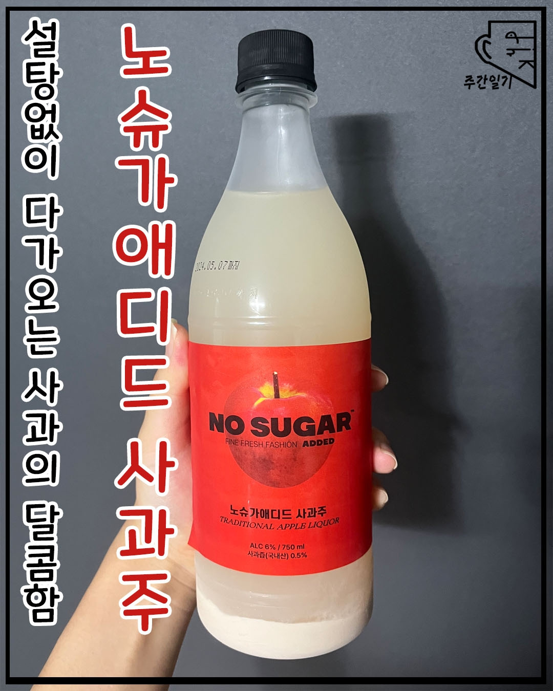 '노슈가애디드 사과주', 그 중 가장 달콤해 보이는 이름을 가진 술이다. '노슈가'라고 적혀있진 하지만, 아스파탐이 첨가되어 있는 것으로 보아 감미료를 설탕의 대체품으로 사용하지 않았을까 싶다. 아스파탐을 사용하고 있으면서 '노슈가'라는 단어를 이름으로까지 쓰는 것이 맞는가 싶긴 하나, 상대적으로 저렴한 값을 가진 탁주는 어차피 대부분 '감미료'로 당분을 채우니 어느정도 이해가 가기도 한다.