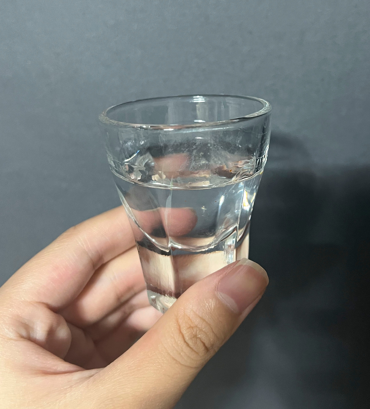 잔에 따른 술은 일반적인 증류주와 같은 모습을 하고 있습니다. 투명하고 매끄러운 것이 겉으로만 봐선 어떤 술인지 알기 어렵습니다.
