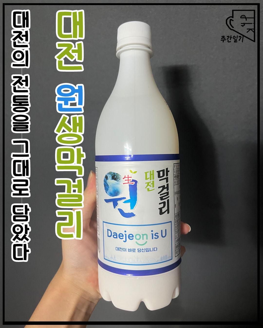 짙은 파란색의 띠지와 슬로건처럼 쓰여 있는 'Daejeon is U', 거기에 폰트를 포함한 전체적인 외관은 '대전'을 상징적으로 나타내고 있으며, 동시에 '원막걸리'에게 궁금증을 더해주는 듯하다.