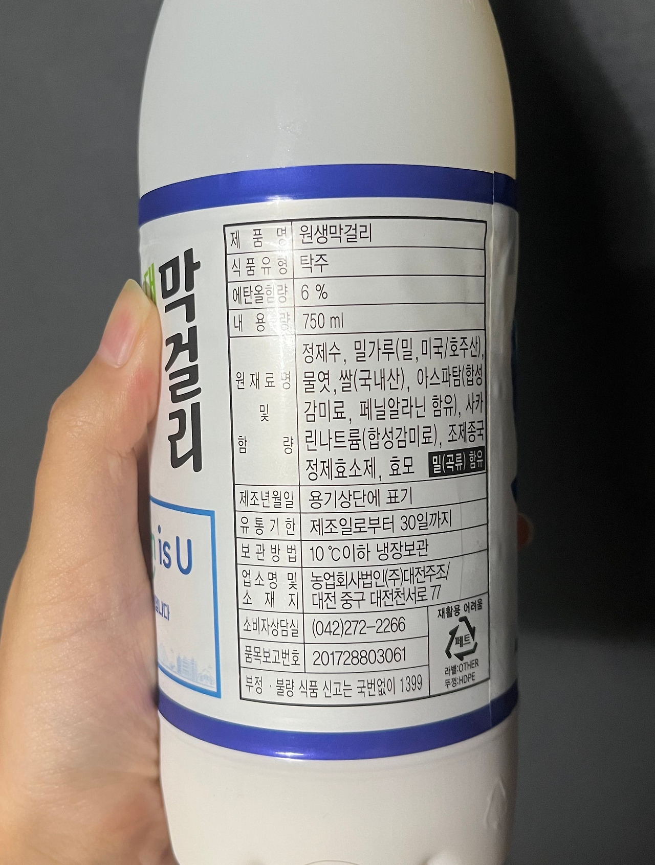 지역 막걸리 치고는 상당히 현대적인 디자인이다. 보통 고장에 자리 잡고 있는 막걸리들을 보면 한눈에 보기에도 예스럽다는 느낌이 들기 마련인데, '대전 원막걸리'는 그런 면에 있어선 궤를 달리하는 모습을 보인다. 아마 리뉴얼을 거치지 않았을까.