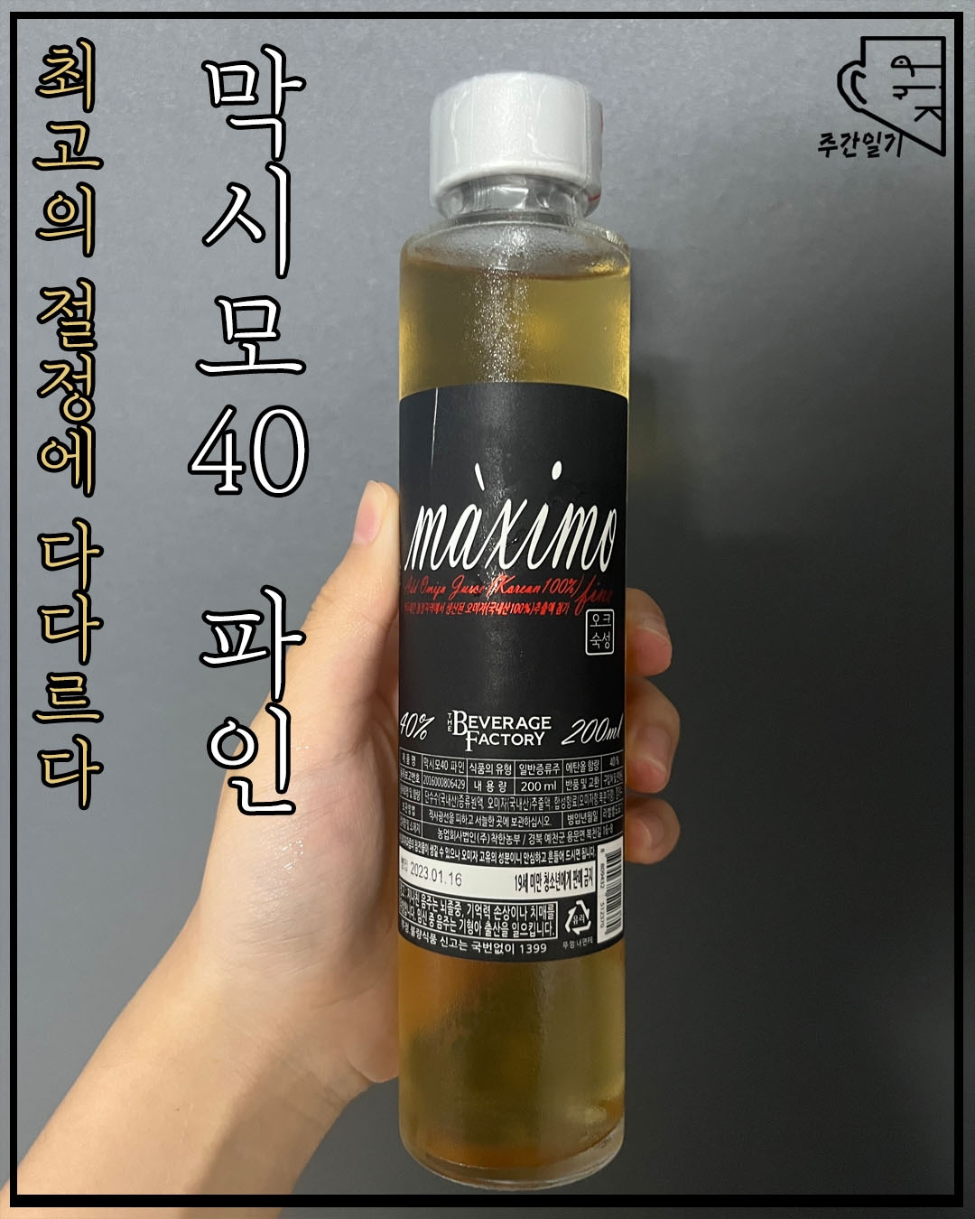 오늘은 그중 상당한 고도수를 자랑하는 술 한 병을 들고 왔다. '막시모40 파인' 스페인어로 최고, 최대, 절정이라는 '막시모'에서 유래되어 최고급 증류주를 선보이고 싶은 그들의 의지를 그대로 담고 있는 증류주이다. 과연 어떠한 독특한 향미로 나를 놀라게 만들어줄지, 뚜껑을 열어보도록 하자.