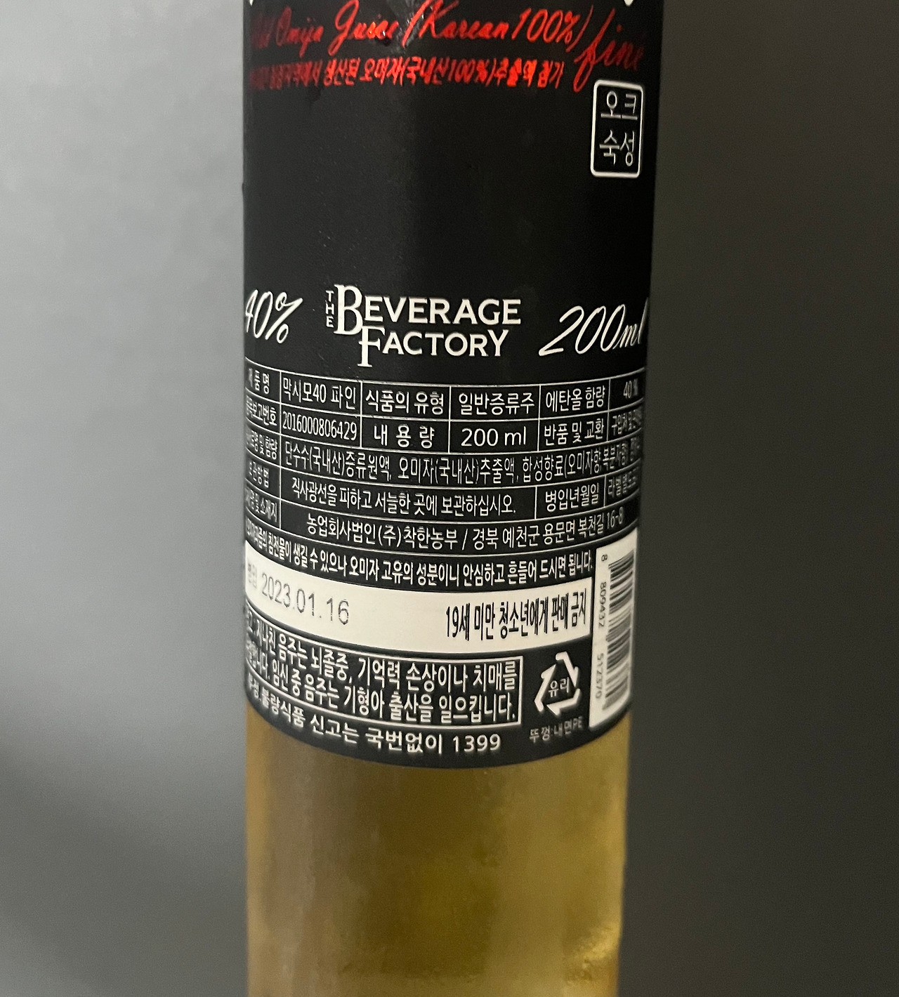 그간 오미자주를 정말 여러 가지 형태라 많이 먹어 보았지만, 이러한 느낌의 오미자 증류주는 처음이다. 톡톡 튀는 과실의 향미와 고도수가 주는 뜨거움을 모두 가지고 있으며, 향과 맛에서 느낄 수 있는 방향이 굉장히 색다르다. 오미자로 시작하여 럼으로 끝맺는 술로서, 새로운 전통주를 맛보는 나에겐 매력적으로 다가왔다.