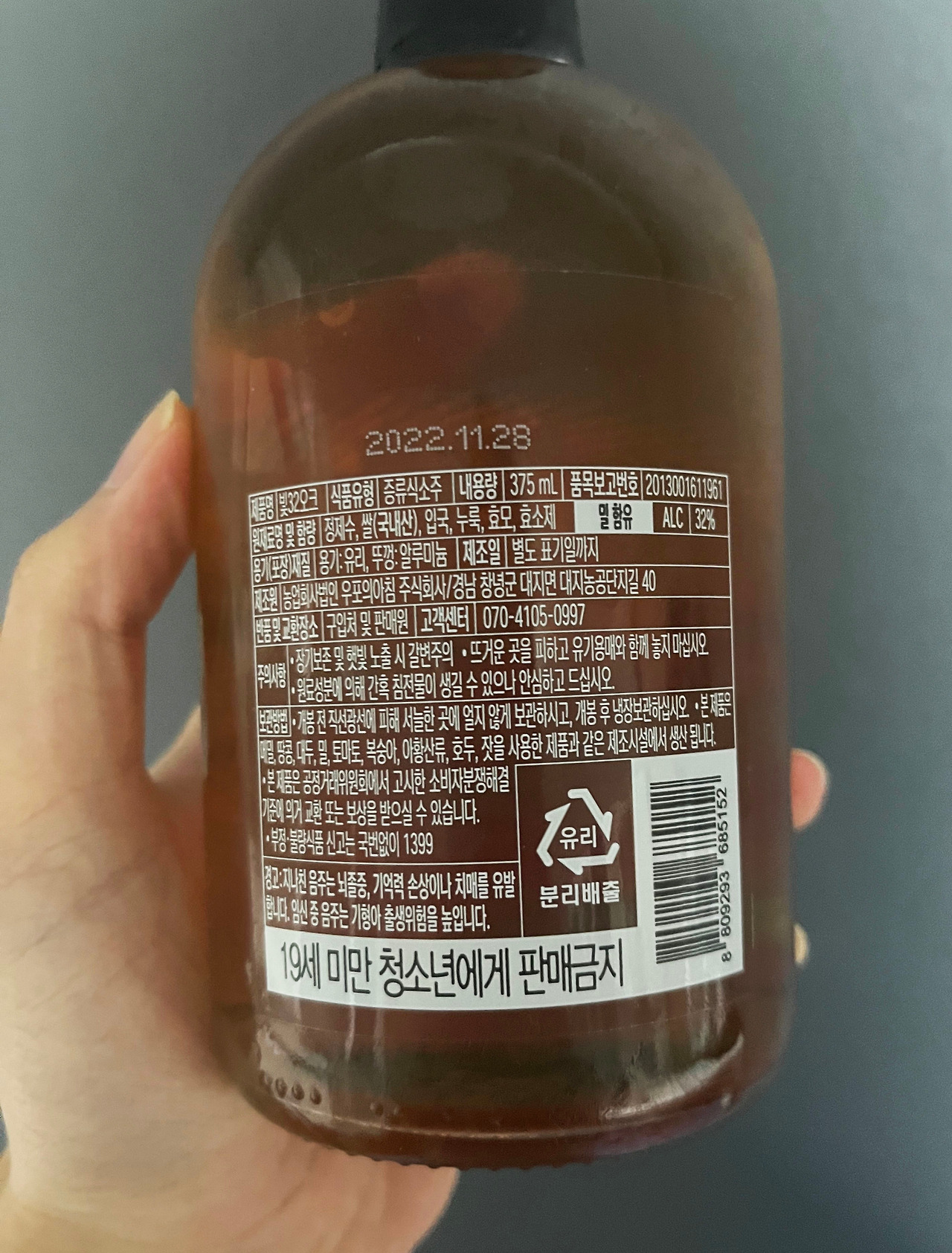 술의 용량은 375ML, 도수는 32도, 가격은 12900원. 도수는 일반적인 증류주에 비하여 높은 편이며, 요즘 출시되는 일반적인 증류주의 가격을 생각하였을 때 약간 비싸다고 느낄 수 있을 정도의 값이다. 분명히 얼마 전까지만 하더라도 만 원대의 술은 상당히 부담스러운 가격처럼 생각되었지만, 최근 출시되는 술들을 보면.. 평범한 가격처럼 다가오는 느낌이 있다.