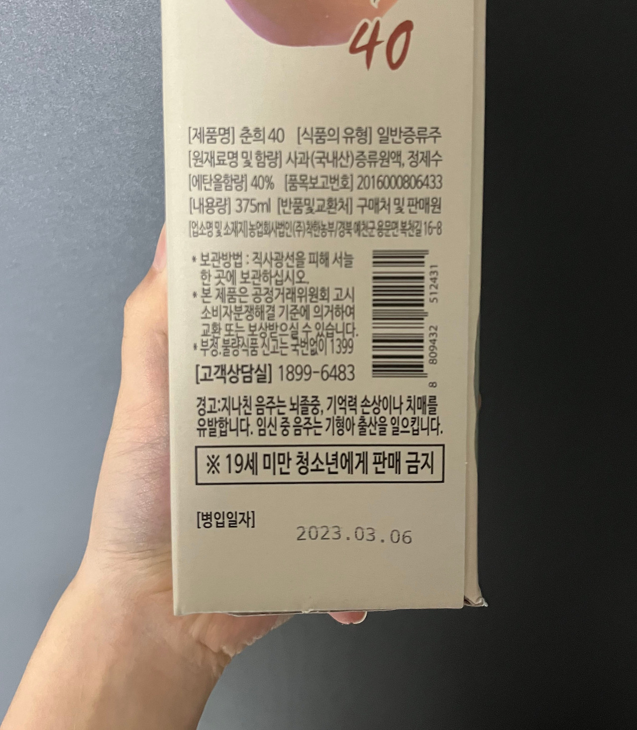 '춘희 40'은 '착한농부'에서 국내산 사과로 빚은 사과증류주로서, 좋은 원료로 정성스레 만들어 사과 고유의 향과 맛을 그대로 즐길 수 있으며, 증류주의 깔끔한 맛과 목넘김이 장점인 술이다.