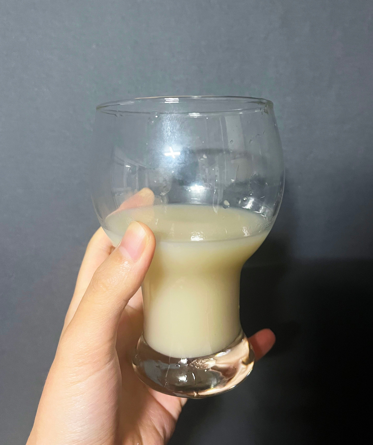 잔에 따른 술은 일반적인 우유보다 살짝 진한 색깔을 선보인다. 딱 우유와 요구르트의 중간정도 빛깔이 아닐까, 왠지 벌써부터 부드럽고 달콤할 것 같은 느낌이 든다.