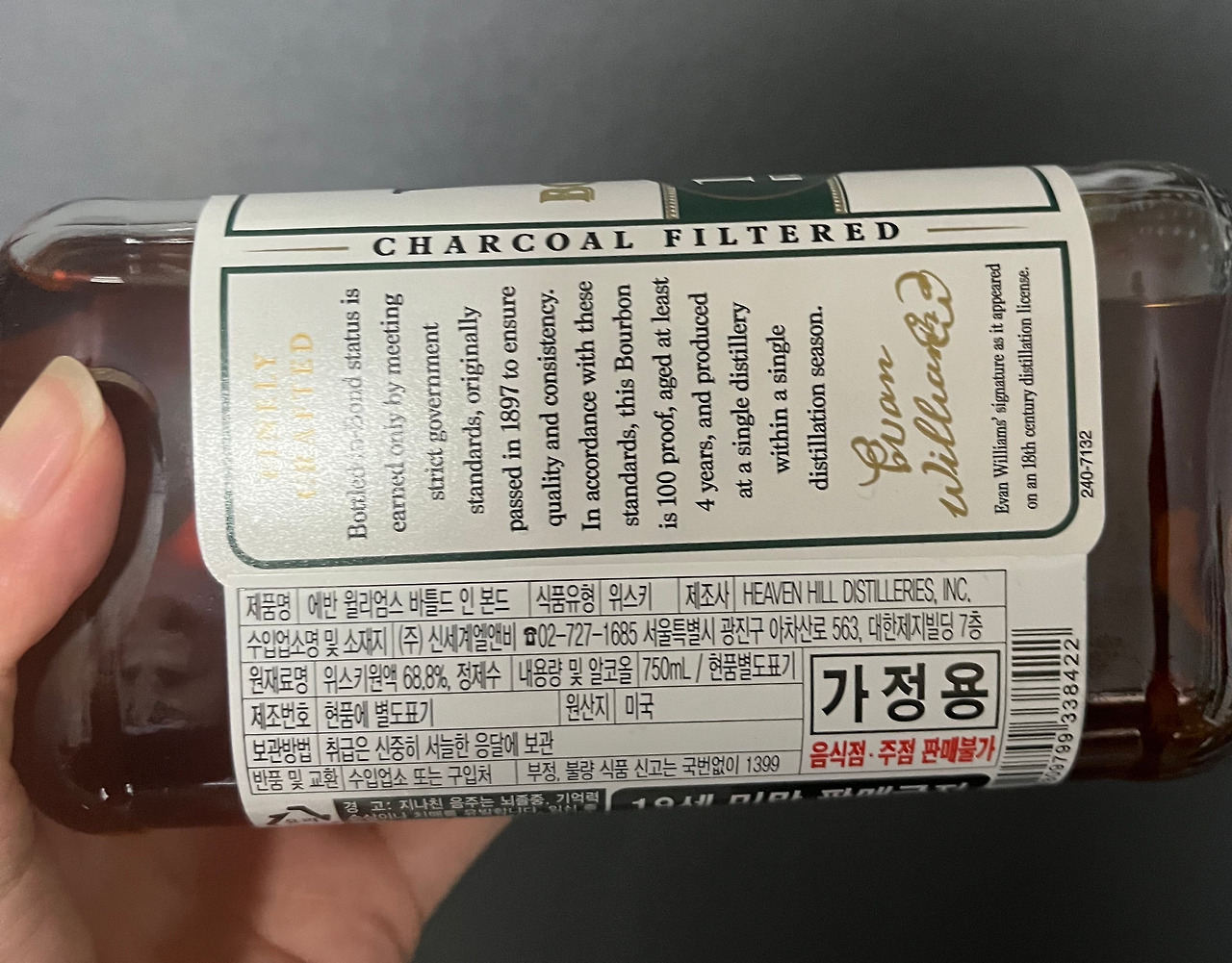 '에반윌리엄스 바틀 인 본드'는 'Heaven Hill Distilleries'에서 탄생한 위스키로서, '바틀 인 본드'라는 단어를 보면 알 수 있듯이 주원료를 51% 이상 사용하였고, 알코올 볼륨을 100 proof로 병입해 표준화된 규격에 맞춰서 태어난 친구이다.