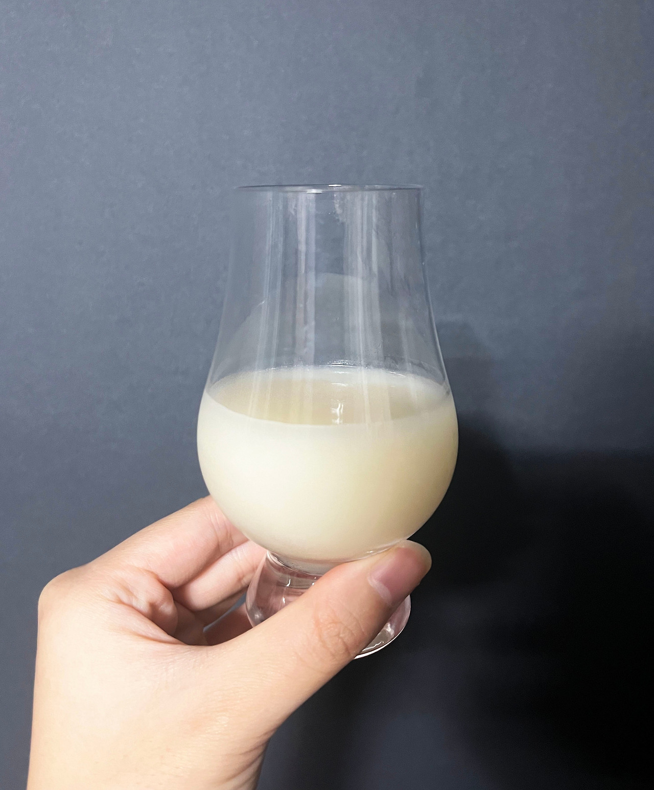 잘 흔들어서 섞어 준 후 잔에 따른 상태이다. 우유보다 한층 밝은 색을 가진 빛깔을 보여주며, 한 눈에 보아도 부드럽고 깨끗한 맛을 가져다 줄 것 같은 느낌이다. 전형적인 맑은 막걸리의 모습이라고 생각된다.
