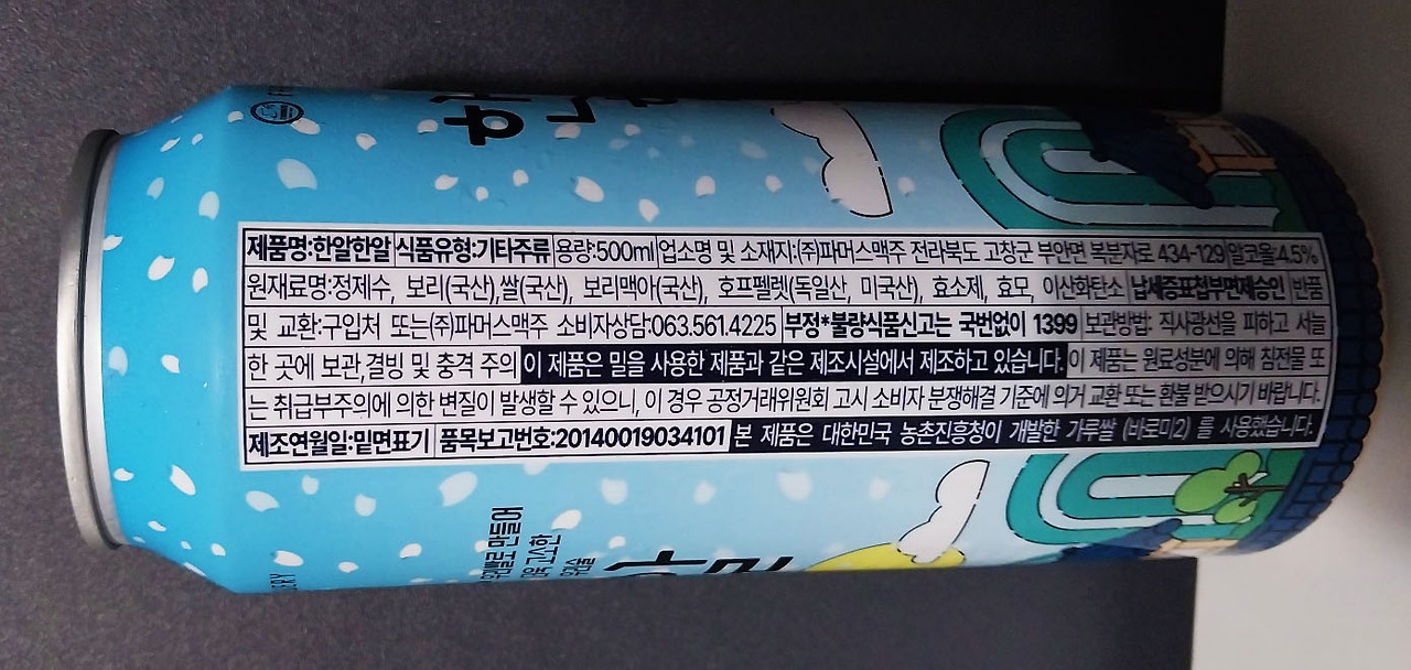 그러한 의미로 오늘은 전통을 담은 우리나라의 술 한 캔을 가지고 왔다. '한알한알', 신기하게도 가루쌀과 맥아를 섞어서 만들어낸 전통주이다. 이 새로운 방식의 술은 과연 어떠한 맛과 향을 가져다 줄지. 캔을 따보도록 하자.