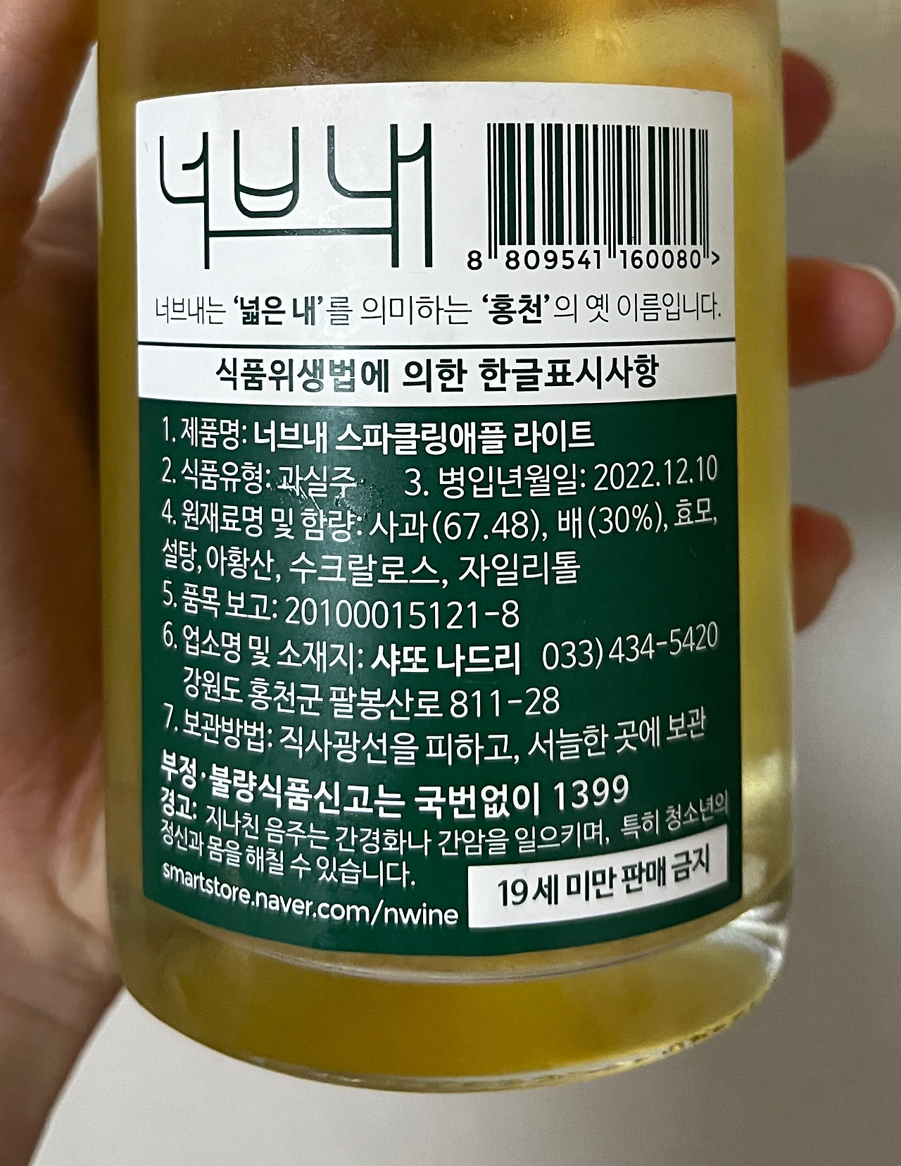 그럼 사족은 여기까지 하고, 이 '너브내 스파클링 애플 라이트'의 가격은 20,000원. 용량은 375ML이며, 도수는 8.5도이다. 온라인에서 구매가 가능하며, 사이트마다 가격차이가 꽤나 나는 편이니 잘 보고 판단한 후에 구매하기를 바란다. 괜히 비싸게 사는 것 보다야, 같은 술이라면 저렴하게 구입하는 게 좋으니까.