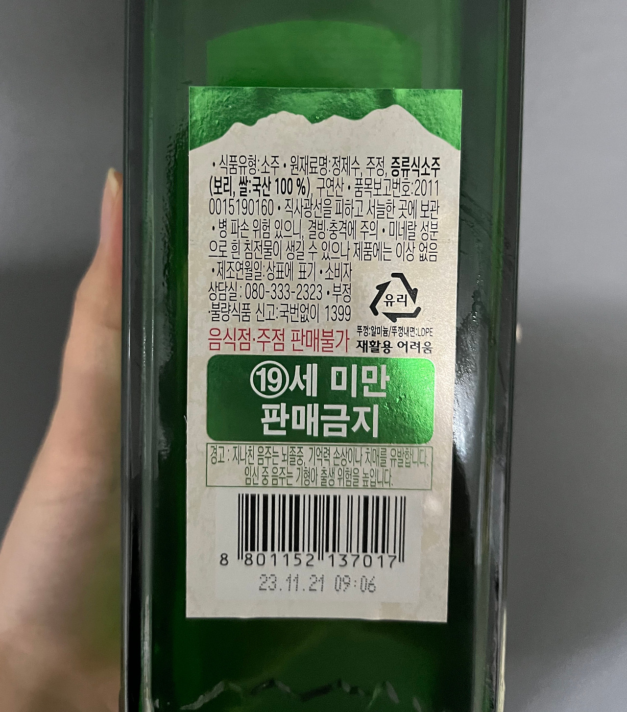 목 넘김 이후에는 별다른 여운 없이 깔끔하게 떨어진다. 이 역시도 다른 희석식 소주에 비해서 장점이라고 말할 수 있겠다. 뒷 면을 보면 증류식 소주가 들어간 것을 확인할 수 있는데, 원재료 명의 경우 비율에 따라서 쓰여지는 순서가 결정되기 때문에 증류식소주를 조금 섞었다, 이 정도로 생각하면 될 것이다.