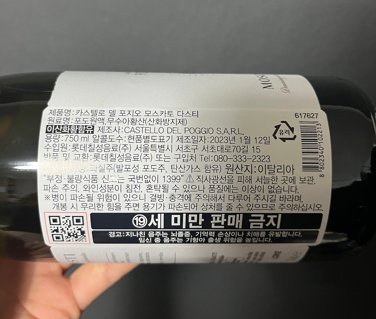 굉장히 가슴이 몽글해지는 날이기에 평소에는 전통주를 즐기는 나 역시 오늘은 와인 한 병을 가지고 왔다. '카스텔로 델 포지오 모스카토 다스티'. 이마트에서 아주 대대적으로 홍보를 하던 술로서, 이탈리아 출신의 DOCG 등급 와인이다. 이 긴 이름을 가진 친구가 과연 어떠한 향과 맛을 보여줄지, 기대와 함께 코르크를 개봉해 보도록 하자.