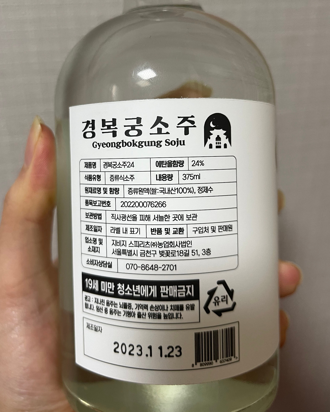 '경복궁소주24'는 '지비지스피리츠'가 어떠한 인공감미료도 없이 100% 국내산 프리미엄 쌀을 이용하여 만든 술로서, 상압증류방식을 이용해 부드럽고 은은한 향을 극대화하였다.