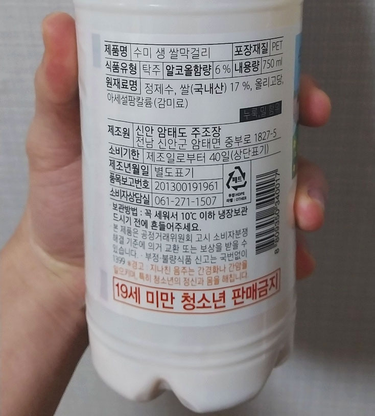 그런 상황에서 오늘은 상당히 저렴한 막걸리 한 병이 눈에 들어와 가져오게 되었다. '수미 생 쌀막걸리', 이름에서 알 수 있다시피 쌀로 만들어진 생막걸리다. 저 멀리 신안에서 건너온 이 친구는 과연 어떠한 맛과 향을 가져다 줄지, 기대와 함께 뚜껑을 열어보도록 하자.