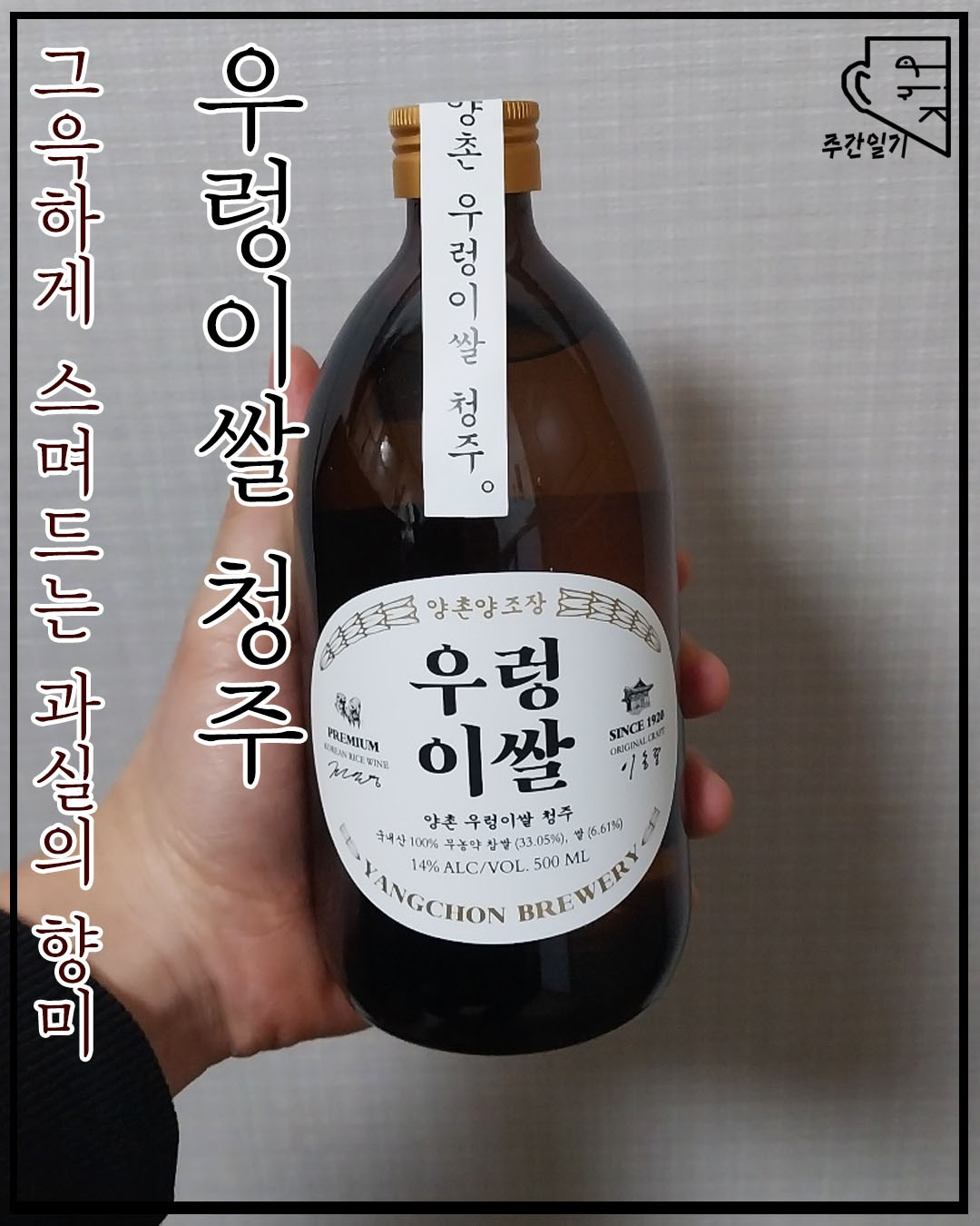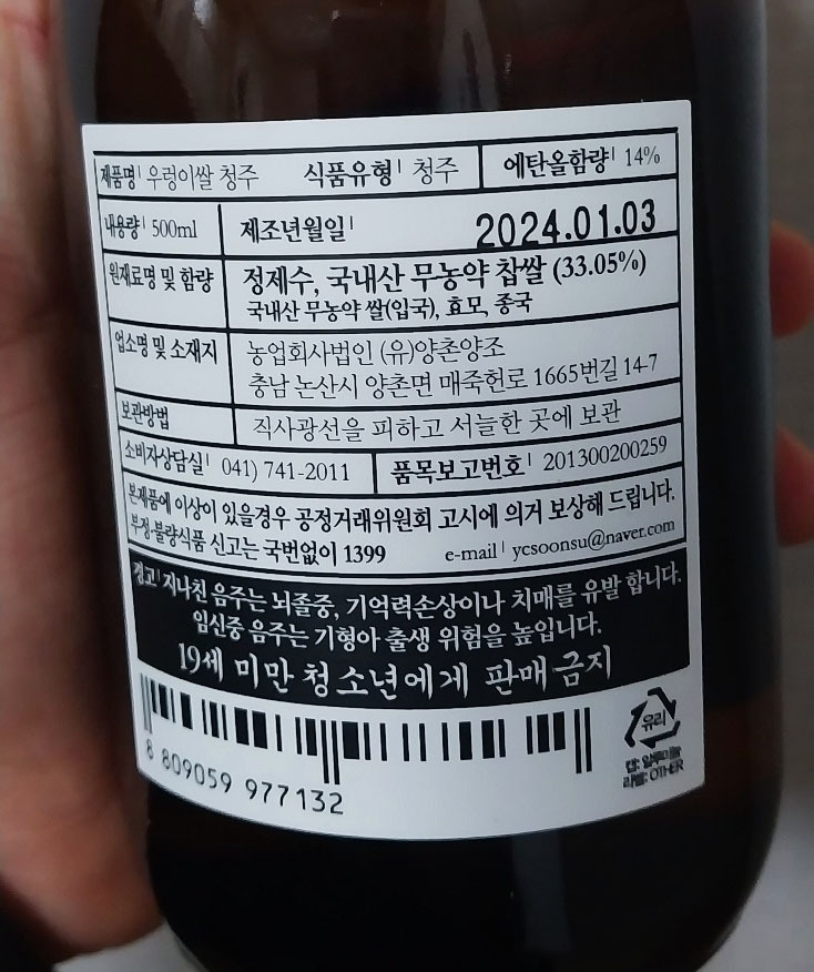 오늘은 다름아닌 이 양촌양조장에서 태어난 술을 한 병 가지고 왔다. '우렁이쌀 청주', 좋은 재료와 100년의 역사를 가지고 있는 장소는 과연 어떠한 작품을 빚어낼지. 기대와 함께 뚜껑을 열어보도록 하자.