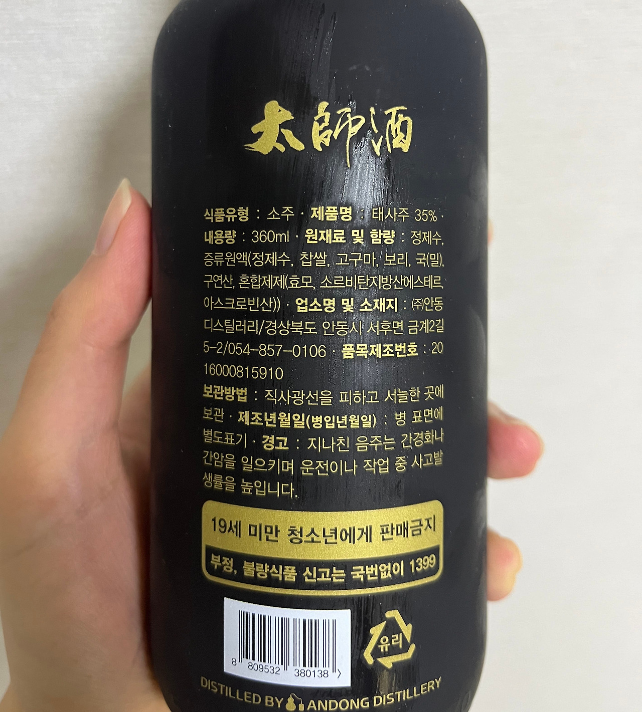 겉으로 보이는 술의 외관부터 심상치가 않다. 묵색으로 뒤덮인 병은 뚜껑까지 검게 물들어 있으며, 전면부에는 '태사주'라는 술의 이름이 유려하고 힘있는 글자체로 적혀 있다. 보통 라벨을 이용하는 다른 술들과는 달리 소주의 명칭 자체가 병에 박혀있는 형태이고, 스스로에 대한 자부심이 깃들어 있기 때문인지 이름 이외에 부가적인 설명은 전혀 보이지 않는다. 흑색의 바탕에 수 놓인 금빛 물결은 사람의 이목을 끌 수밖에 없도록 만드는 듯하다.