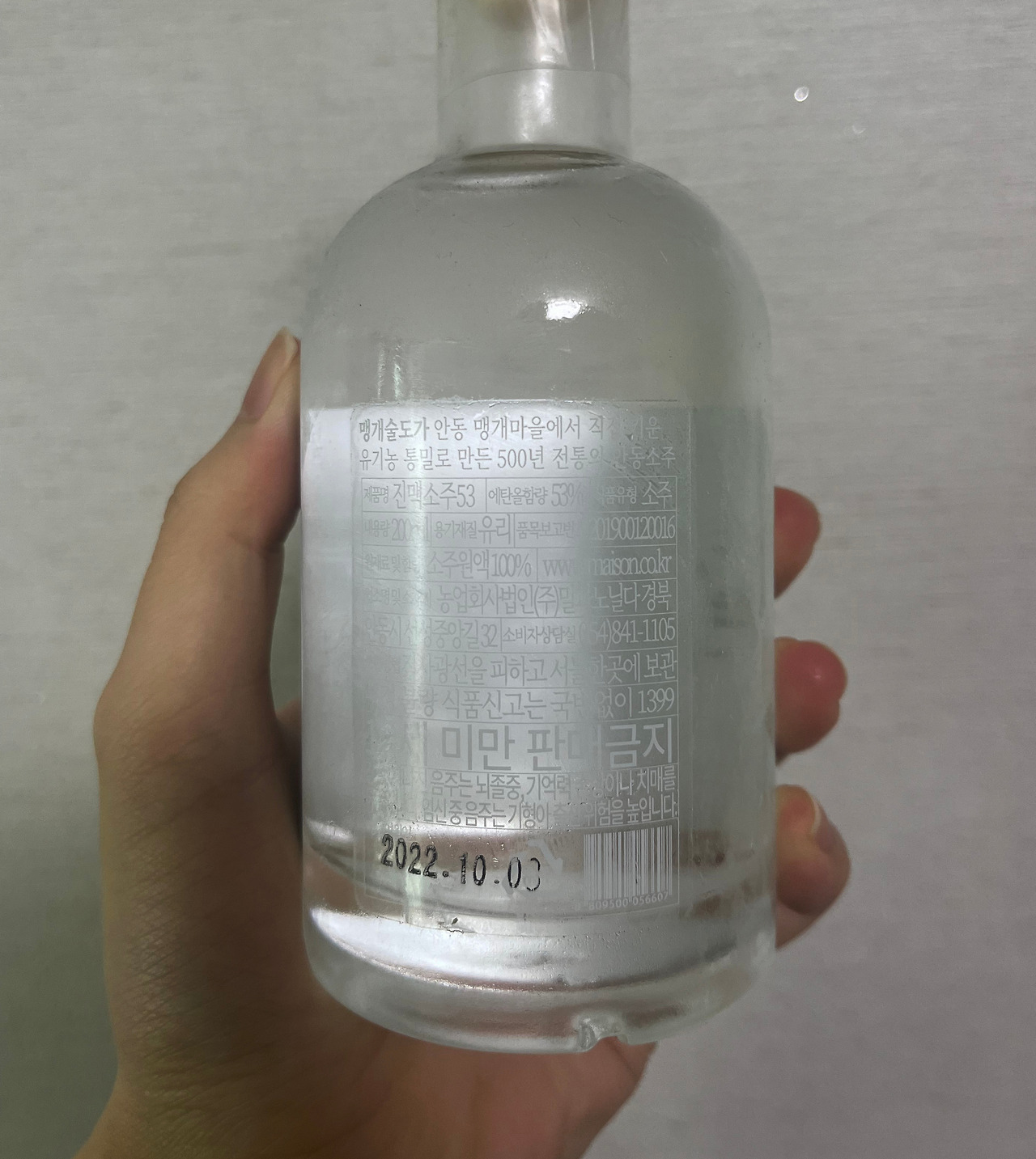 오늘은 상당히 높은 도수로 눈에 띈 술을 한 병 가지고 왔다. '안동 진맥소주53', 이름에서 예상할 수 있다시피 무려 53도라는 대단한 알코올 함유량을 보유한 친구이다. 국내 유일의 밀로 만든 소주이자 50도가 넘는 대단한 알콜을 가진 이 술의 맛과 향은 어떨지, 빠르게 뚜껑을 열어보도록 하자.