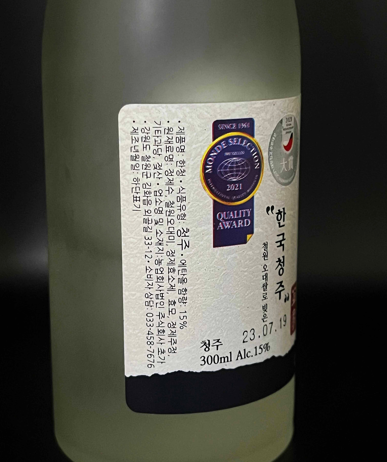 그냥 보기에도 한국의 미가 흐르는 듯한 외관이다. 형태 자체는 그리 특별하지 않으나 흐릿하게 마감된 병의 안쪽과 전면부에 보이는 한지를 두른듯한 라벨이 잘 어우러져 있으며, '한청'이라는 이름 역시 일반적인 글자체가 아닌 옛 한글을 사용하여 전통적인 멋을 더하였다. 왼쪽에 따로 '한국청주'라고 적혀 있는 것을 보니 술의 명칭인 '한청'이 '한국청주'의 줄임말이 아닐까 예상되는데, 여러모로 작품에 대한 자부심이 강하게 담겨 있는 듯하다.