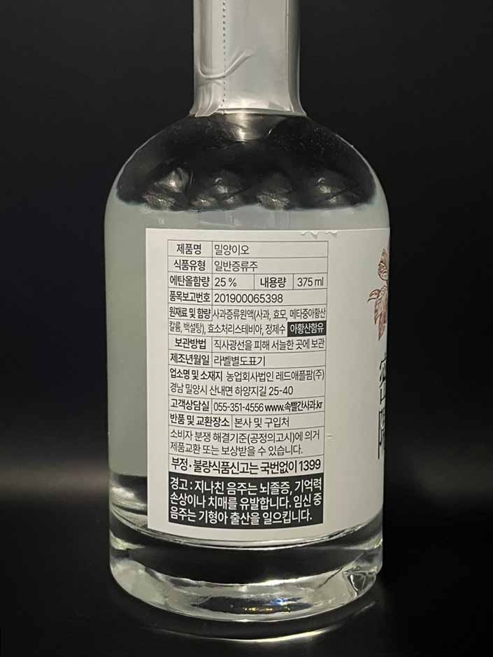 '밀양이오'는 '레드애플팜'에서 얼음골사과를 발효 후 상압식 동증류기를 이용하여 증류한 소주형태의 사과증류주로서, 독립운동가인 약산 김원봉 선생을 연상케 하는 작품이다.