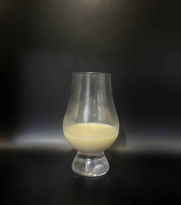 잔에 따른 술은 산뜻한 상아색을 뽐낸다. 우유와 비슷한 빛깔을 지니고 있으나 그보다 약간 짙은 느낌을 가져다주며, 술방울 역시 어느 정도 무게감 있게 흘러내리는 형태를 띠고 있다. 참 깔끔해 보이는 면모이다.
