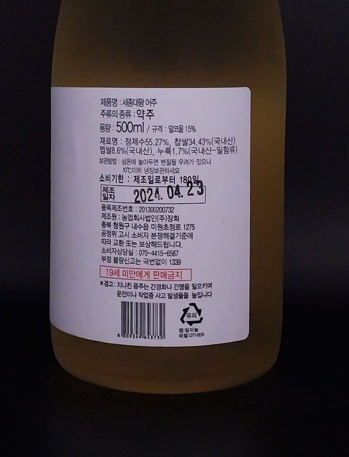 일단 겉으로 보이는 생김새부터 상당히 고급스럽다는 것을 알 수 있다. 고급 탁주에서 간혹 볼 수 있을 것 같은 뭉툭하면서도 유려한 곡선을 타고 올라가는 병의 형태를 취하고 있으며, 그 끝은 금색으로 곱게 감싸져 있는 상태이다. 전면부에는 '세종대왕어주'라는 술의 이름이 여타 설명 없이 떡하니 박혀 있는데, 이 자신감이 '대통령상 수상'이라는 이력과 병 안쪽으로 비치는 아름다운 빛깔과 더해지니 전혀 어색함 없이 하나의 작품을 완성시킨다.