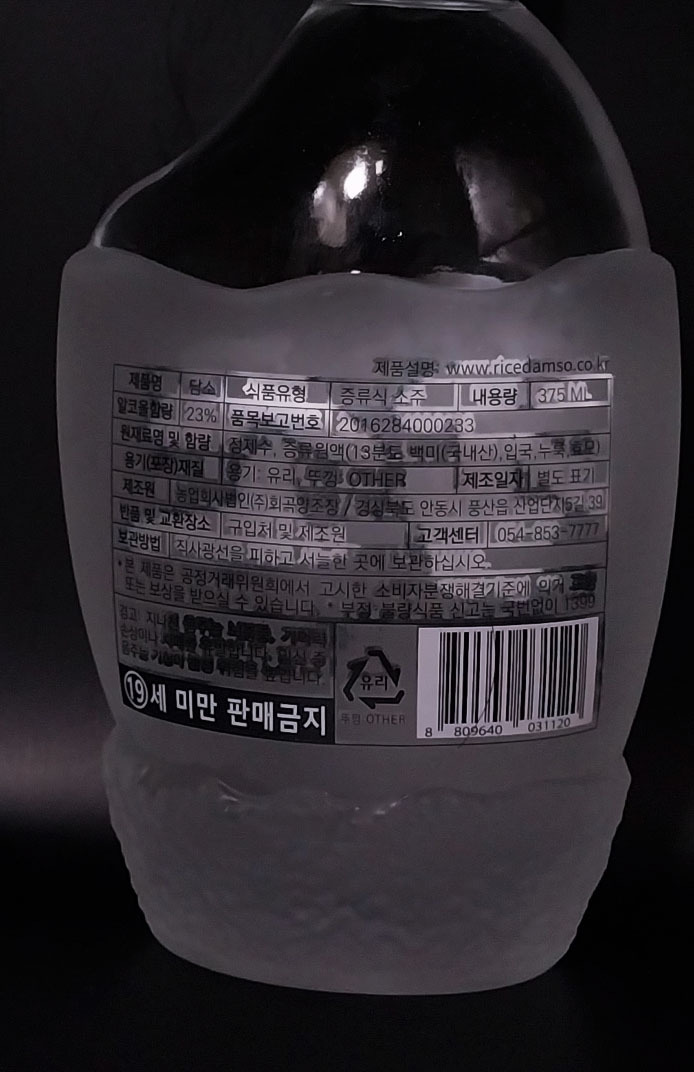겉모습만 보아도 맛을 궁금하게 만드는 매혹적인 외모를 지닌 친구이다. 자연이 빚어낸 수석에서 볼 수 있을법한 밑둥과 도자기를 깎아놓은 듯한 술의 몸체, 그 위로 매끄럽게 빠져 올라가는 병목까지. 이 정도 가격에 사실 찾아보기 힘들 정도로 신경을 쓴 디자인이라는 생각이 들며, 라벨지가 아닌 병 자체를 특별하게 만들어냈기에 외관에 대한 가치는 다른 술에 비해 상당히 높다고 여겨진다. 이어서 전면부로 시선을 돌리면 '담소'라는 술의 이름이 한국을 대표하는 자연과 함께 그려져 있는 모습을 확인할 수 있는데, 이 역시 멋들어진 병과 합쳐져 술을 마시기 전임에도 기대감을 올려준다.