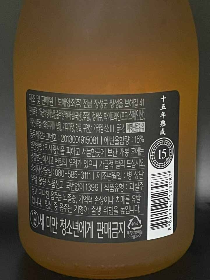 '15년 숙성 매취순'은 전남 장성군의 '보해양조'가 빚어낸 술로서, 국내 매실주라인의 대표주자 중 하나인 '매취순'의 프리미엄 버전이다. '15년 숙성'이라는 이름답게 15년숙성매실침출원액을 이용하여 만들어졌으며, 신기하게도 원재료 중 화이트와인을 확인할 수 있다.
