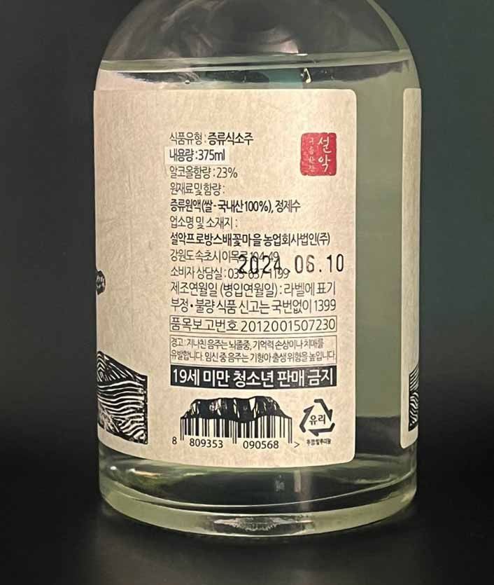 잔에 따른 술은 병 안으로 보였던 것처럼 투명한 빛깔을 가지고 있다. 앞서 설명처럼 설악산 물을 그대로 옮겨온듯한 깨끗함을 선보이고 있으며, 보통 마주하는 증류주와 큰 차이가 없다. 이 술이 어떤지는 결국 마셔봐야 알 일이다.