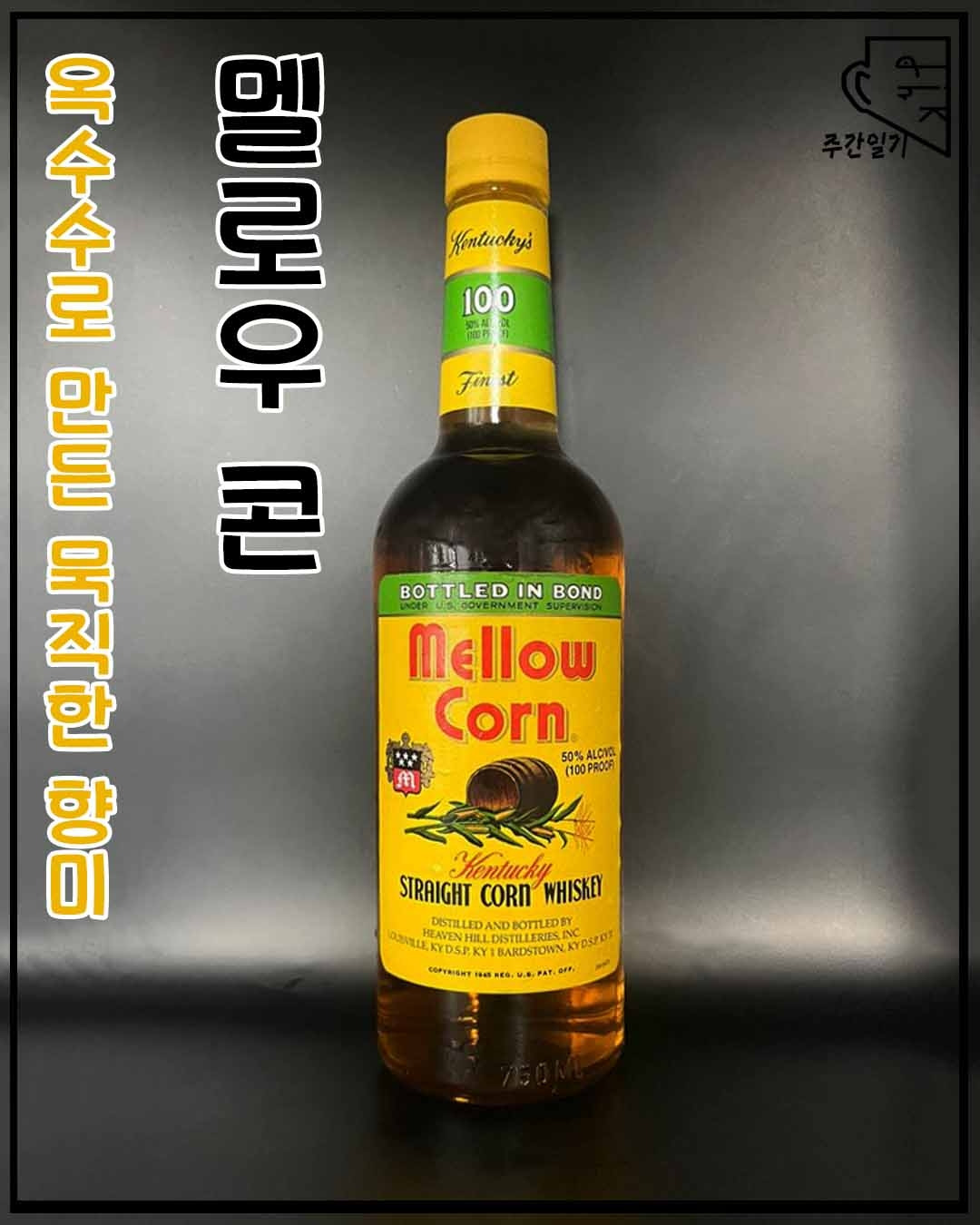 '멜로우 콘' 위스키는 미국 헤븐 힐 증류소의 대표 위스키인 '에반 윌리엄스'를 숙성한 오크통에서 4년간의 숙성 과정을 거쳐 탄생한 작품으로서, '콘 위스키'라는 이름답게 옥수수 함량 기준이 80%를 넘어간다.