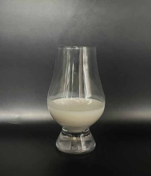 잔에 따른 술은 정말 우유처럼 깔끔하고도 새하얀 빛깔을 선보인다. 최근에 보았던 탁주 중 가장 깨끗한 표면을 가지고 있지 않나 싶다. 표면에선 오돌토돌한 기포 몇 방울이 톡톡 터지고 있으며, 이 백색의 아름다움이 너무나도 진한탓에 꼭 눈을 쌓아놓은 것 같은 착각까지 불러일으킨다. 다만 염두해야할것이, 이 친구가 보기보다 뚜껑을 열 때 상당히 사나운 편이다. 아무 생각 없이 흔든 다음 개봉하다 큰 낭패를 봤으니, 다들 폭발의 예술을 느끼고 싶지 않다면 조심하도록 하자.