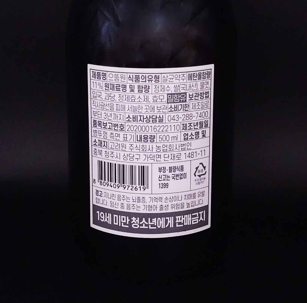 작품의 용량은 500ML, 도수는 11도, 가격은 5040원. 혼자 마셔도 좋고, 둘이 마셔도 나쁘지 않을 양에 술을 잘 즐기지 못하는 사람도 마실 수 있을듯한 알콜 함유량, 일반 희석식 소주의 약 두 배정도의 금액을 지녔다. 보통은 가격이 딱 떨어지는 반면, 신기하게도 5040원이 판매가인 제품이다.
