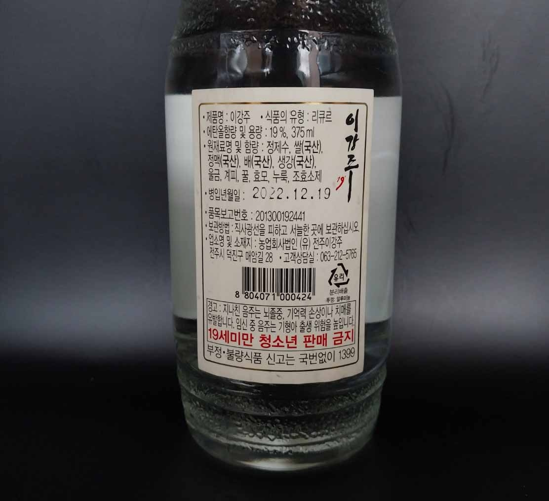 겉으로 보이는 외관부터 평범한 병들과는 차이점을 선보인다. 재질은 플라스틱이 아닌 유리로 되어있고, 반투명하게 올라가는 곡선 사이 병목과 몸체 가운데 나이테처럼 새겨진 무늬가 한층 더 가치를 높여준다. 다만 병 자체에서 올라간 고급스러움과는 달리 라벨은 비교적 평범한 도안을 보이고 있는데, '이강주19'라는 술의 이름이 멋들어진 글자로 하얀 배경에 적혀있을 뿐이었다. 물론, 당연하게도 이 역시 부정적이란 소리는 아니지만 병의 디자인에 비해 조금은 밋밋한 라벨에 약간의 아쉬움이 따르긴 한다.