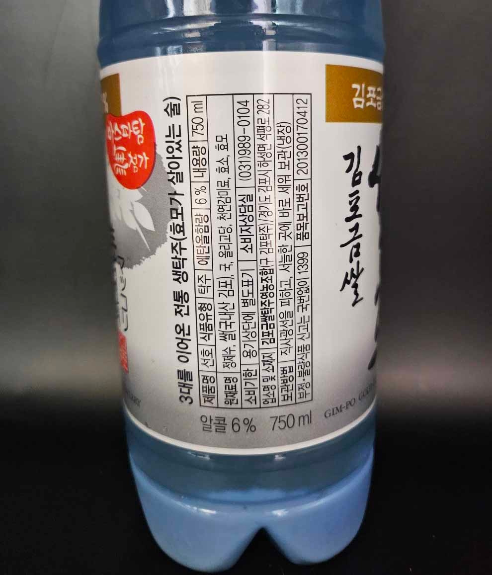 일단 겉으로 보이는 병의 외관부터 심상치 않다. 사실 형태 자체는 이 용량대에서 흔히 볼 수 있는 것이지만, 이렇게 퍼런색으로 물들여진 병은 어디서 쉽사리 마주할 수 있는 것이 아니다. 하얀 술들 사이에서 얼마나 눈에 띄던지. 안쪽에 자리잡고 있는 술의 빛깔을 확인할 수 없는 것은 아쉽긴하나, 그렇다고해서 도저히 그냥 지나칠수가 없더라. 전면부의 라벨엔 '김포금쌀 선호 생막걸리'라는 술의 명칭이 굵고 흩날리는 느낌으로 적혀져 있으며, '무아스파탐'이라는 포인트 역시 빠지지 않고 나타나 있다.