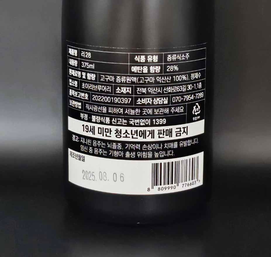 '리28'은 전북 익산시의 '초이리브루어리'에서 태어난 작품으로, 익산 베니하루카 고구마의 깊고 진한 풍미를 그대로 담아 빚어낸 증류식 소주이다.