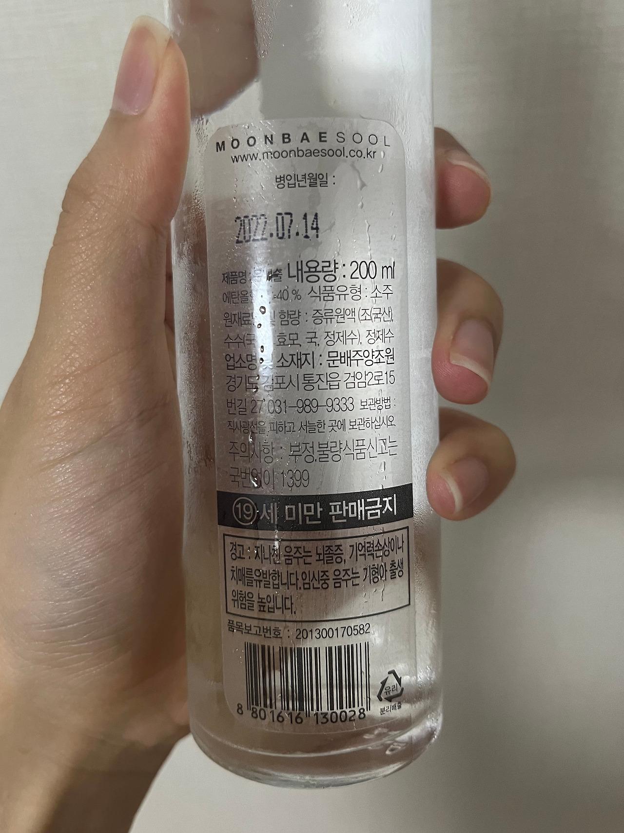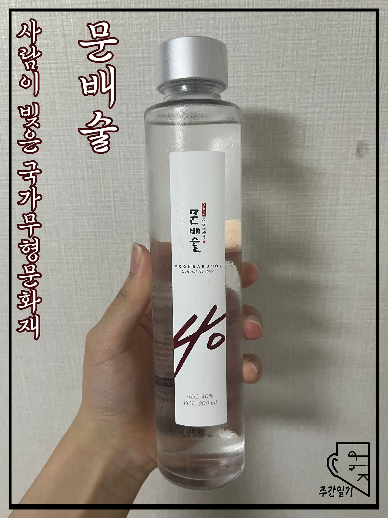 용량에 따라 병의 상태가 다르게 되어있으며, 나는 맛을 보기 위해 비교적 저용량인 200ML를 구매하였다. 40도라는 높은 도수를 간직한 술병의 외관은 비교적 평범한 모습이다. '문배술'이라고 정갈하게 쓰인 글씨와 도수를 나타내는 40이 끝.