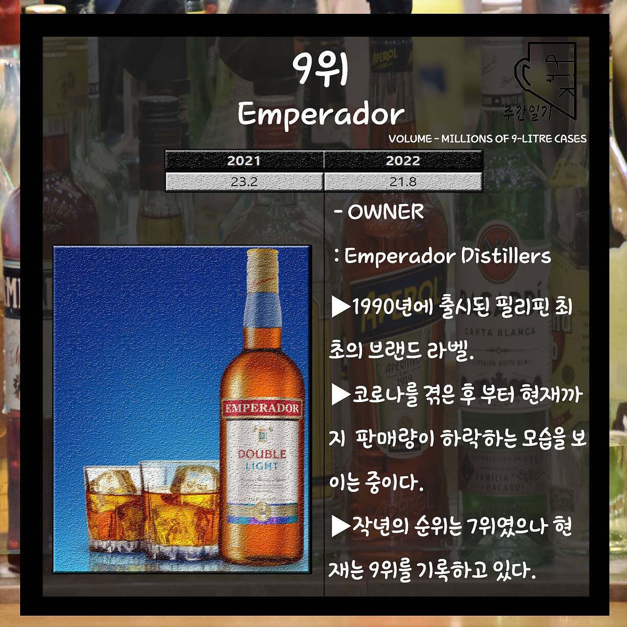 9위는 '엠페라도'이다. 1990년에 최초의 필리핀 브랜드 라벨로 출시된 엠페라도는 '브랜디' 카테고리에서 아직까지 많은 사랑을 사람들에게서 받고 있는 중이다.