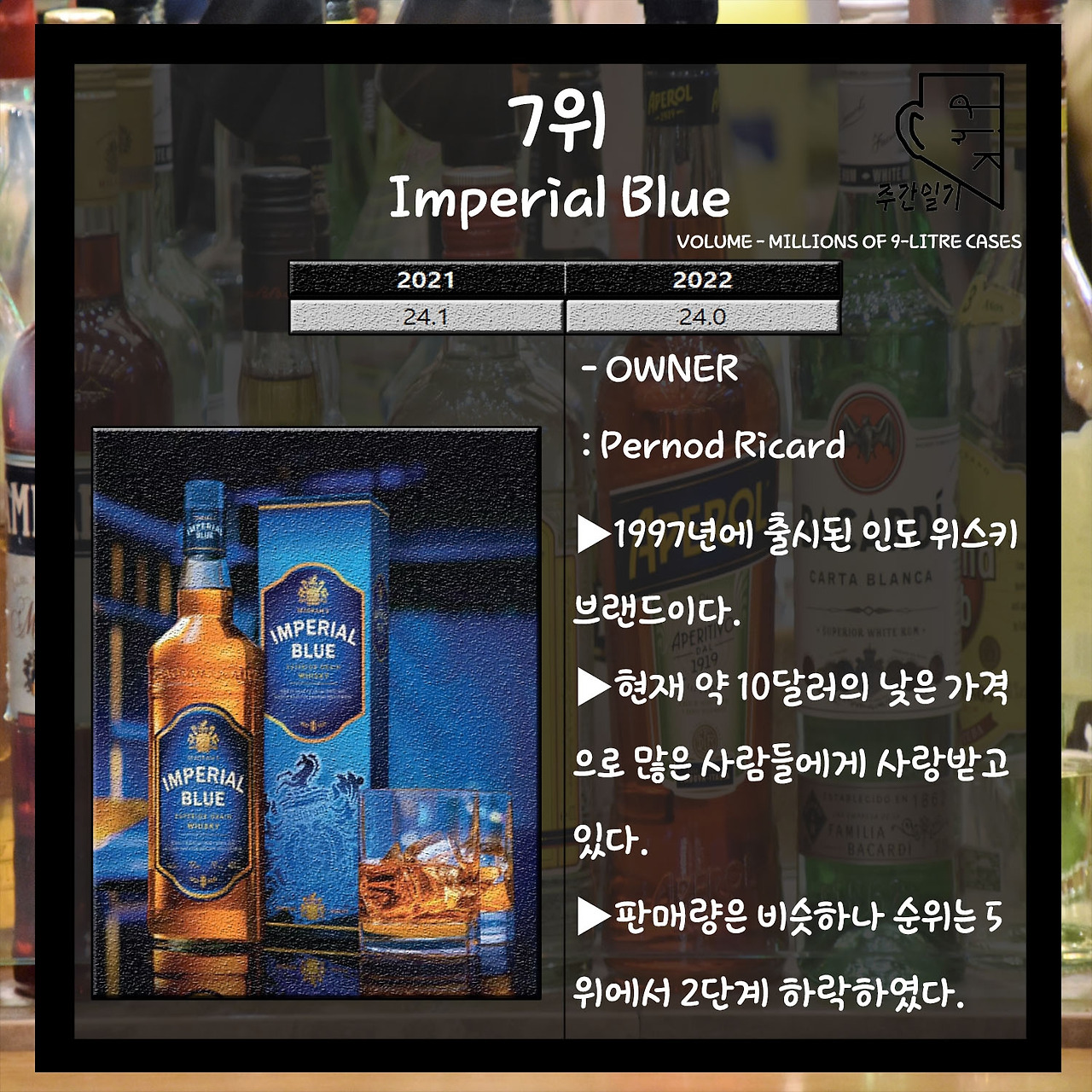 이어서 7위는 '임페리얼 블루'이다. 국내에서는 유명하지 않으나 세계에서 판매량만큼은 순위를 달리는 인도 위스키 중의 하나로서, 1997년 출시되어 낮은 가격으로 인해 많은 사랑을 받고 있다.
