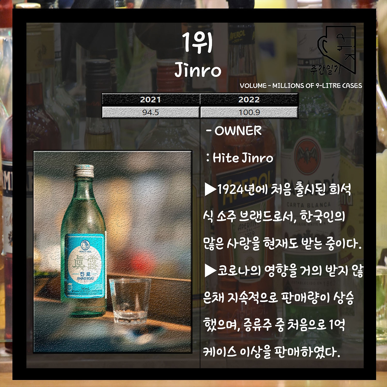 오늘은 여러분이 들으면 놀랄 수도 있는 대단한 소식을 한 가지 가져왔다. 바로 우리나라의 '진로'가 'Drinks International'이 조사한 2022년 백만장자 클럽에서 당당히 1등을 차지했다는 것.
