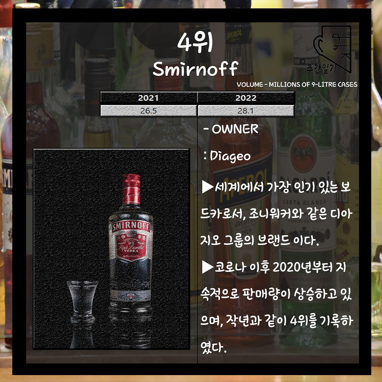 4위는 세계에서 가장 인기 있는 보드카이자 한국에서도 대형마트를 방문하면 언제나 쉽게 마주할 수 있는 '스미노프'이다. 윈저, 조니워커, 베일리스 등을 소유하고 있는 디아지오 그룹의 브랜드이며, 무려 세계 130여 개 국에서 판매되고 있는 명실상부 인기 주류다.