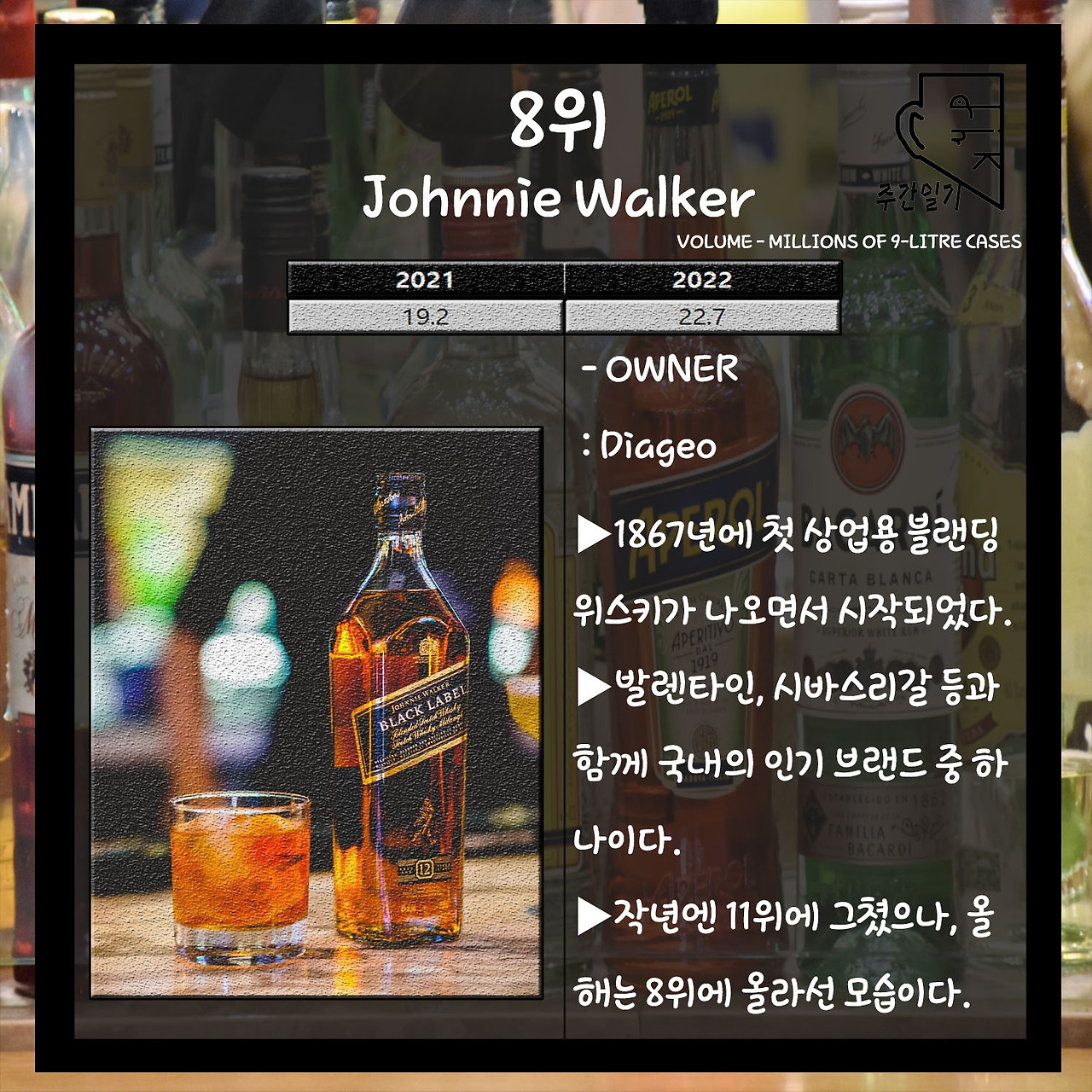 내려가는 술이 있으면 올라오는 술도 있는 법, 작년엔 바카디에 근소하게 밀려 10위 안에서 얼굴을 비추지 못했던 조니워커가 드디어 10등 안으로 들어섰다.