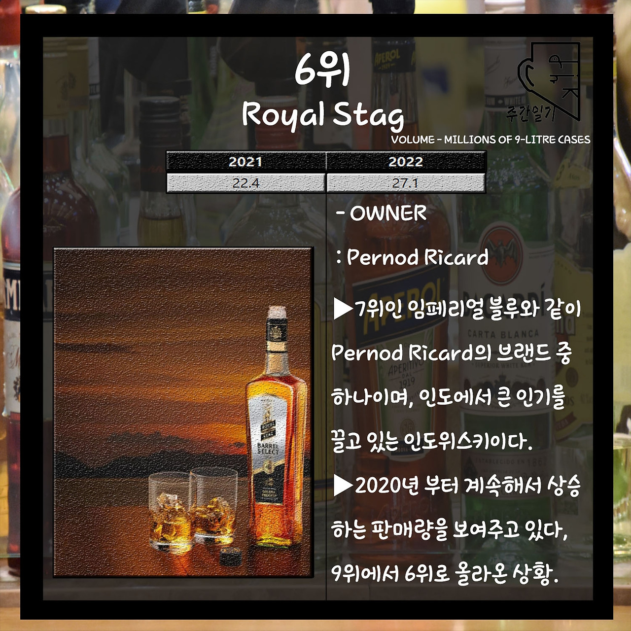 6위는 '임페리얼 블루'와 같은 인도 위스키인 '로열 스태그'이다. 'Pernod Ricard'의 브랜드 중 하나인 '로열스태그'는 인도에서 굉장히 큰 인기를 끌고 있는 위스키이다. 네팔에서 생산되어 현지에서 자란 곡물과 스카치 몰트 위스키를 혼합해 만들어지며, 현재 전 세계에서 만나 볼 수 있다.