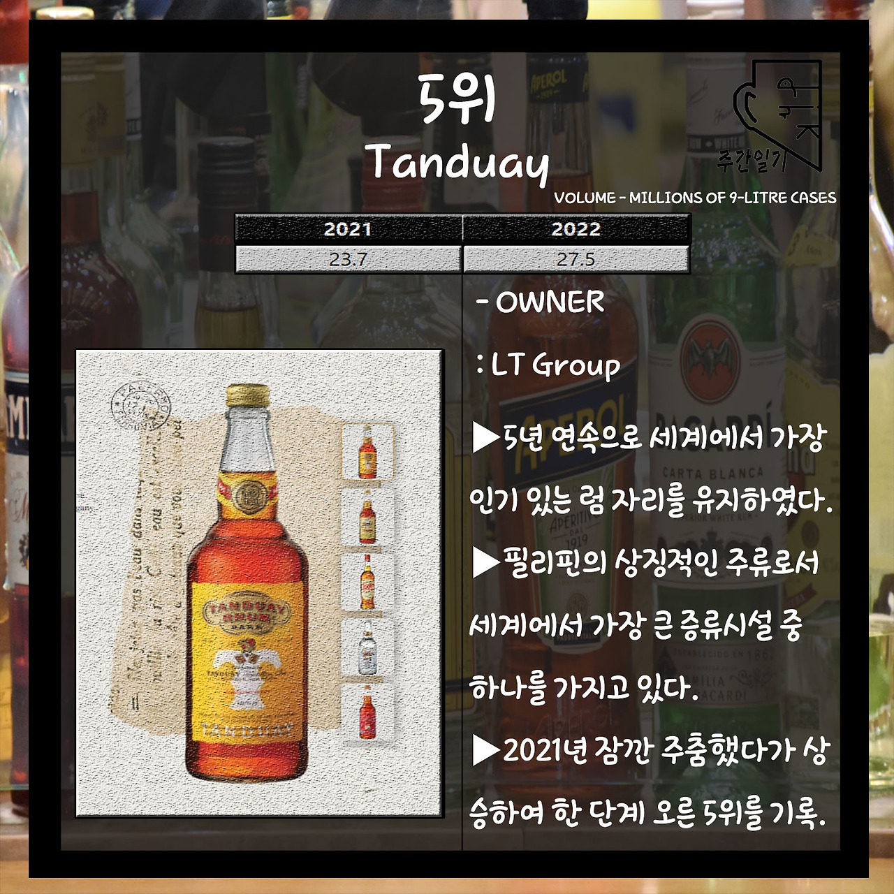 5위는 5년 연속으로 세계에서 가장 인기 있는 럼 자리를 차지한 'Tanduay'이다. 필리핀의 상징적인 주류로서 세계에서 가장 큰 증류시설 중 하나를 가지고 있으며, 바카디의 순위를 뛰어넘은 이후 아직까지 한 번도 그 차이가 좁혀진 적이 없다.