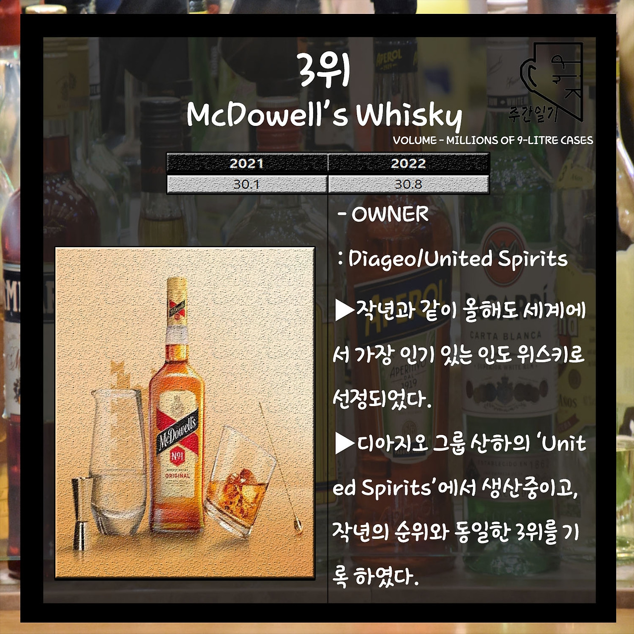 3위는 '맥도웰즈 위스키'이다. 우리에겐 생소하나 세계에서 가장 인기 있는 인도 위스키로서, 아프리카, 캐나다, 일본, 중동 등 다양한 지역에서 판매되며 대단한 인기를 끌고 있다. 위에서 설명하였던 조니워커와 같이 디아지오의 산하 브랜드 중 하나이다.