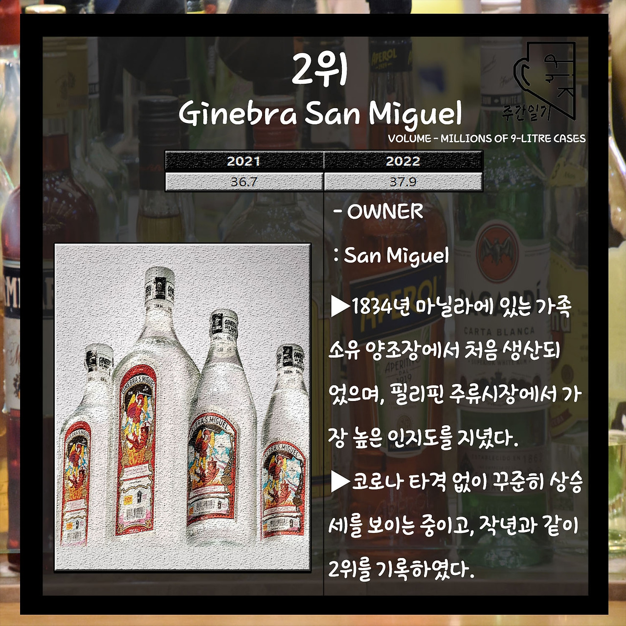 다른 '진'에 비하여 압도적인 순위를 보여주고 있는데, 참고로 산미구엘을 제외한 다음 진인 'Gordon's'의 순위는 한참 떨어진 28위이다.