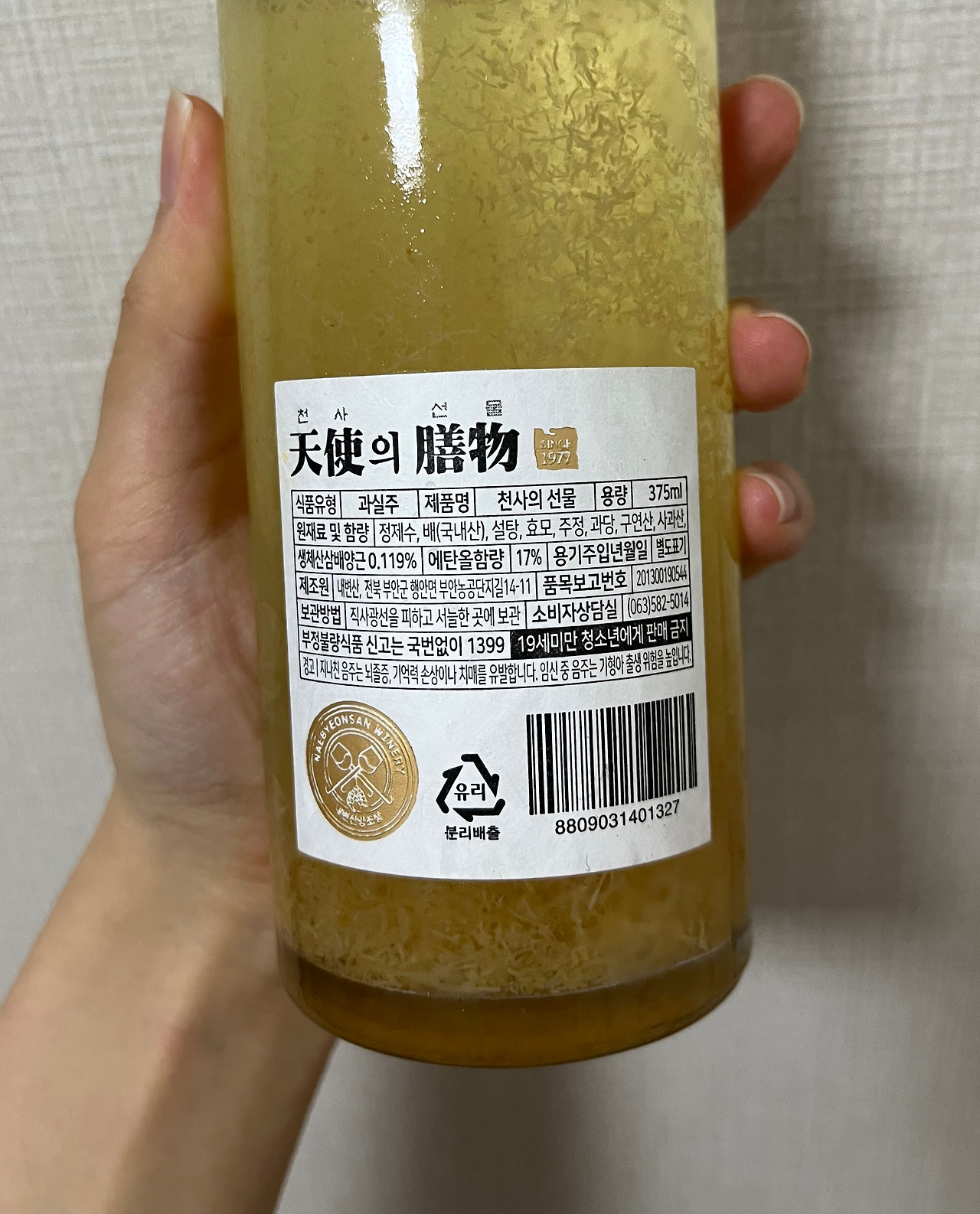 내가 이 술을 가져온 것은 새로운 술을 찾아 온라인 마켓을 뒤지던 중 우연히 한 사이트에서 상당히 눈에 띄었기 때문이었다. '천사의 선물'이라는 이름도 그렇지만, 겉모습 역시 한국적이면서도 아름다워 스크롤을 내리던 나의 손가락을 순식간에 멈추게 만들었다. 외관과 명칭, 거기에 산삼과 배를 넣은 꽤나 매력적인 조합까지. 아마 대부분의 술을 좋아하는 사람이라면 이 한국적인 술을 보고서 그냥 지나치기는 힘들 것이다.