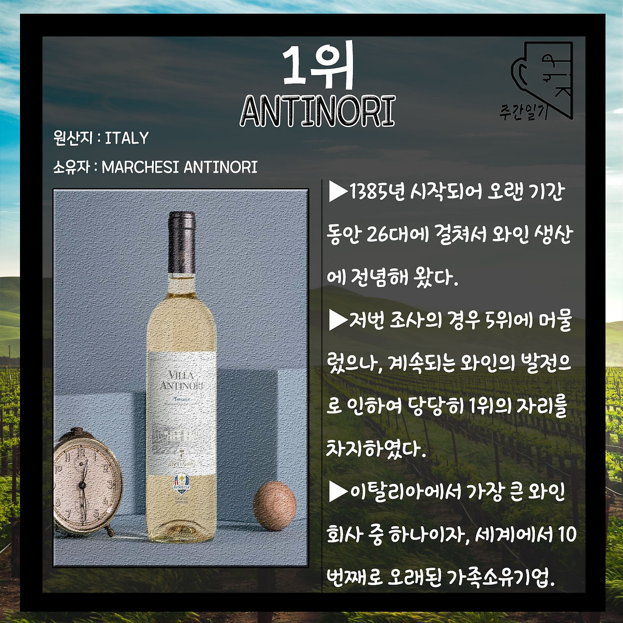 대망의 1위는 'ANTINORI'이다. 1385년 시작되어 굉장히 오랜 기간 동안 26대에 걸쳐서 와인 생산에 전념해 온 브랜드로서, 이탈리아에서 가장 큰 와인 회사 중 하나이자 세계에서 10번째로 오래된 가족소유기업이다.