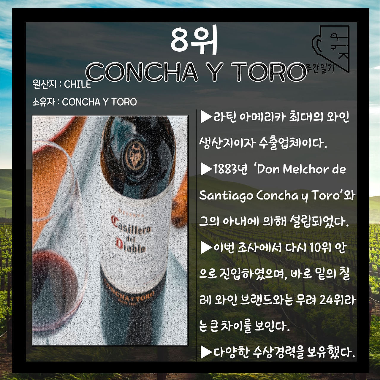 8위는 나름 우리에게 꽤나 익숙한 와인 브랜드인 'CONCHA Y TORO'이다. 라틴 아메리카 최대의 와인 생산지이자 수출업체인 이 브랜드는 1883년 'Don Melchor de Santiago Concha y Toro'와 그의 아내에 의하여 설립되었다.